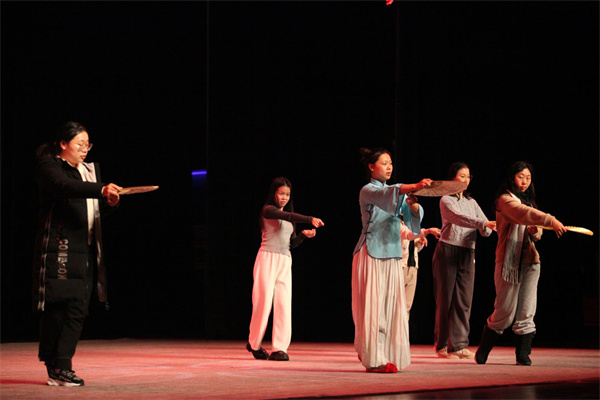 剧组乐班三位乐手吹奏国乐名曲《百鸟朝凤》。演员李轩为大家展示了淮剧艺术的手眼身法步,多位观众上台学习体验淮剧身段技巧。优秀淮剧小生邱海东仍以陈世美原扮相登台,演出了《琵琶寿》选段《见娇儿》。其他演员如徐良玉、王丹丹、王俊杰、陆晓龙、徐琪、高挺纷纷换装,各携拿手的经典淮剧唱段,上台献艺。《金龙与浮游》《探寒窑》《十五贯》《铡美案》《武训》……一个个分量十足的经典选段,一声声功底深厚的淮剧唱腔赢得北大观众声声叫好和热烈掌声,驱散了北京的寒潮和演出取消的遗憾。
